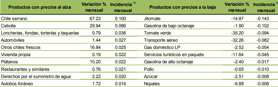 La variación se debió a un incremento de productos agropecuarios como cebolla y chile serrano, lo cual fue parcialmente contrarrestado por las bajas en las gasolinas, transporte aéreo, paquetes turísticos y gas doméstico LP.