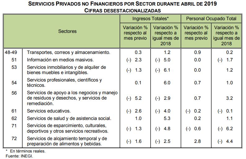 Durante abril de 2019, los ingresos totales reales por suministro de Bienes y Servicios Privados no Financieros disminuyeron 3.1 por ciento, respecto al mes previo con cifras desestacionalizadas, de acuerdo con el Instituto Nacional de Estadística y Geografía (Inegi).