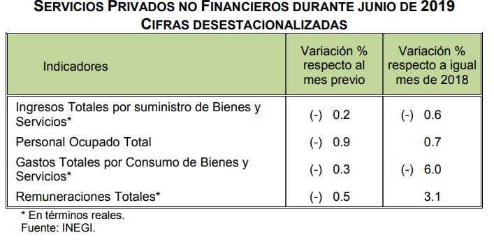 Con cifras originales y en términos anuales, el índice agregado de los ingresos reales obtenidos por la prestación de los servicios privados no financieros bajó 1.2 por ciento en junio respecto a igual mes del año pasado, con lo cual en el primer semestre acumula una caída a tasa anual de 0.5 por ciento.