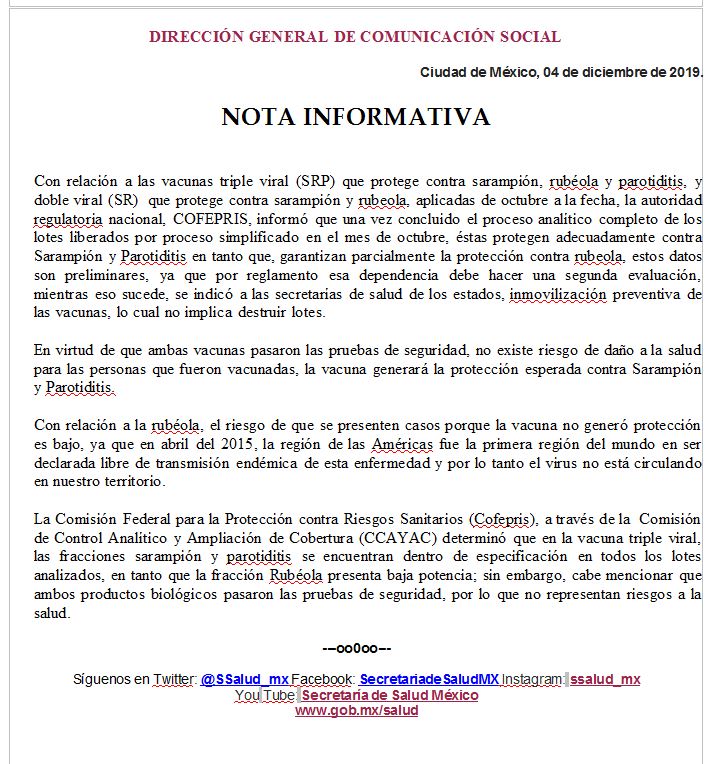 La Secretaría de Salud señaló que, una vez concluido el análisis de los lotes de las vacunas liberados en el mes de octubre, se concluyó que protegen adecuadamente contra sarampión y parotiditis.