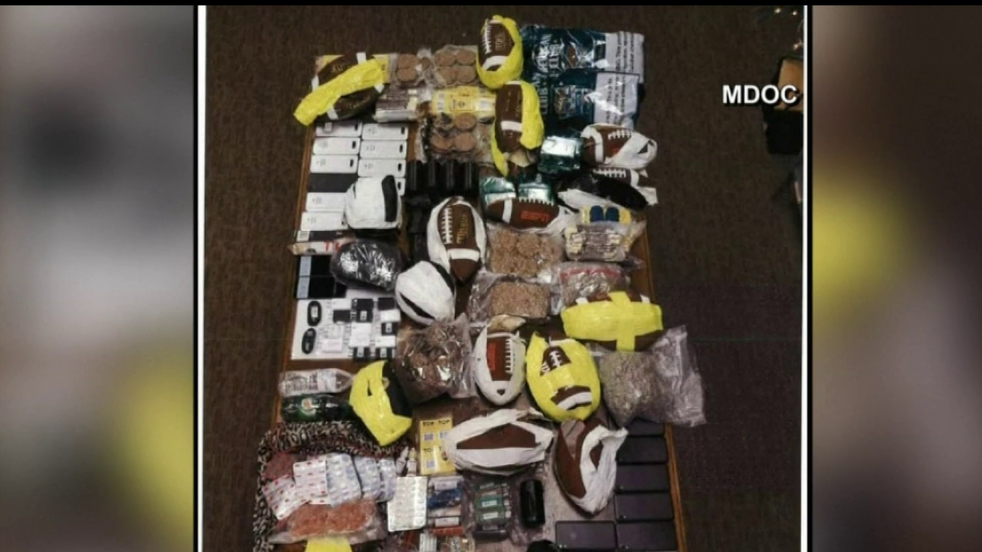 El contrabando se dividió en 25 paquetes, que incluían 38 teléfonos celulares, puros, 20 libras de tabaco y papel de fumar, 4 libras de marihuana y 7 libras de alitas de pollo a la parrilla.