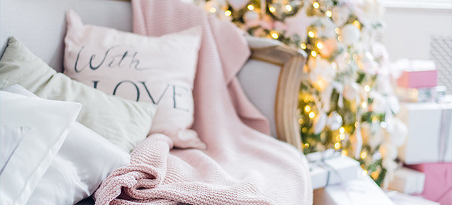 Mantener cosas elegante esta Navidad en tu cojín de despedida de soltera con suaves tonos de rosa y crema en medio de tu decoración. Comience por crear un árbol de Navidad flocado, cubierto con luces blancas, adornos de color rosa suave, plateado y verde espuma de mar. Luego agregue toques alrededor de su hogar en los mismos tonos–tal vez una almohada de temática navideña, medias estampadas y velas de pilar. Los tonos de gris también combinan bien con este tema al igual que los acentos de mármol.