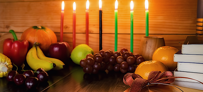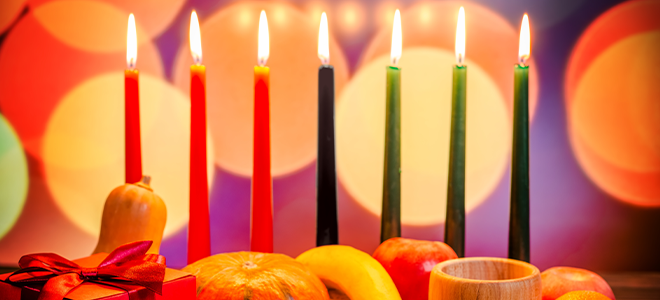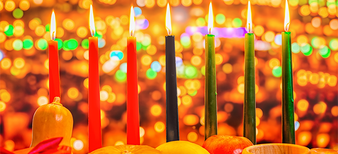 Kwanzaa se celebra tradicionalmente con una fila de siete encendidos velas en un candelabro llamado kinara. Tener estas velas en su hogar durante esta época del año significa su dedicación a las vacaciones y realza la celebración. Se encienden en un orden específico para representar los siete principios de Kwanzaa.