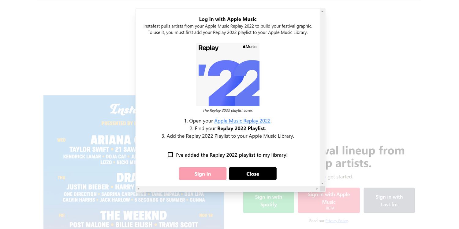 La buena noticia es que Instafest agregó la capacidad de iniciar sesión en el servicio con una cuenta de Apple Music. Sin embargo, por el momento, esta opción se ha marcado como ‘beta’, lo que sugiere que los usuarios pueden encontrar posibles fallas en la integración o aún pueden tener limitaciones en las funciones. Sin embargo, para probarlo, los usuarios primero deben agregar su respectiva lista de reproducción de Apple Music Replay 2022 a su biblioteca de Apple Music para que Instafest tenga una fuente de donde extraer los nombres de los artistas.