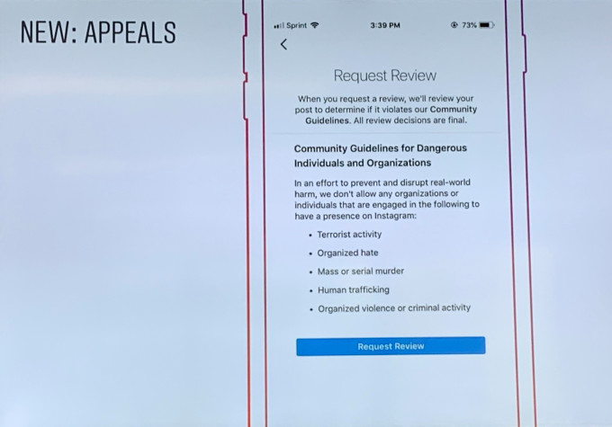 Una nueva interfaz en la aplicación que se lanzará a partir de hoy en los próximos meses permitirá a los usuarios obtener "una segunda opinión en la publicación", dice la jefa de política de Instagram, Karina Newton. Un moderador de Facebook diferente revisará la publicación y restaurará su visibilidad si se eliminó incorrectamente, e informará a los usuarios de su conclusión de cualquier manera. Instagram siempre permite a los usuarios apelar suspensiones de la cuenta, pero ahora alguien que afirma que su publicación fue eliminada por error por desnudez cuando no estaban desnudos o con odio, en realidad era una broma amistosa.