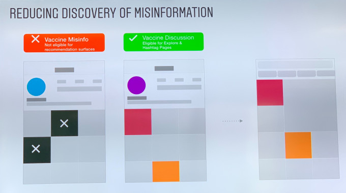 En el frente de la información errónea, Instagram comenzará a bloquear las páginas de etiquetas de etiquetas relacionadas con la vacuna cuando el contenido que aparezca en una página de etiquetas incluya una gran proporción de contenido verificable de contenido de vacunas. Si hay algún contenido infractor, pero por debajo de ese umbral, Instagram bloqueará un hashtag en una publicación de "Solo para arriba" donde las publicaciones recientes no aparecerán para disminuir la visibilidad de contenido problemático. Instagram dice que probará este enfoque y lo expandirá a otros géneros de contenido problemático si funciona. Instagram también estará publicando información educativa a través de una ventana emergente para personas que buscan contenido de vacunas, similar a lo que se usó en el pasado para autolesiones y contenido de opioides.