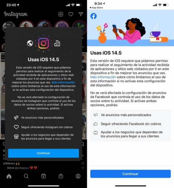 Este aviso pide al usuario permiso para ser rastreado utilizando como mensaje ‘Seguir ofreciendo Instagram sin cobros’, además de indicar que es una forma de llegar a muchos más negocios que dependen de los clientes.