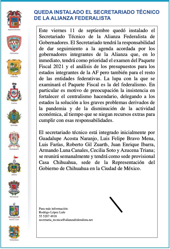 Este viernes quedó instalado el Secretariado Técnico de la Alianza Federalista (AF) de Gobernadores el cual tendrá responsabilidad de dar seguimiento a la agenda acordada por los gobernadores integrantes de la Alianza que tendrá como prioridad el examen del Paquete Fiscal 2021, así como el análisis de los presupuestos para los estados miembros de la AF, pero también para el resto de las entidades federativas.