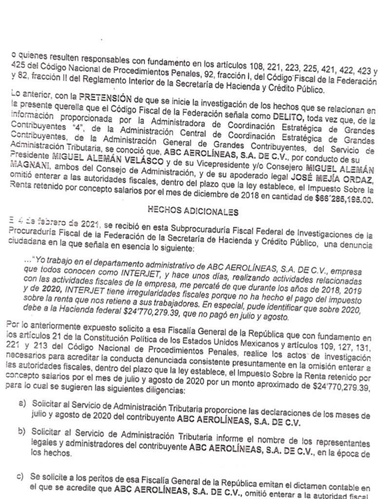 En febrero de este año la Secretaría de Hacienda, a través de la Procuraduría Fiscal de la Federación, presentó una denuncia ante la Fiscalía General de la República (FGR) contra Miguel Alemán Velasco, Miguel Alemán Magnani (hijo y nieto del ex presidente Miguel Alemán) y ABC Aerolíneas -controladora de Interjet- por la omisión que se presentó en el pago de impuesto sobre la renta retenido por concepto de salarios, lo que constituye un fraude fiscal.