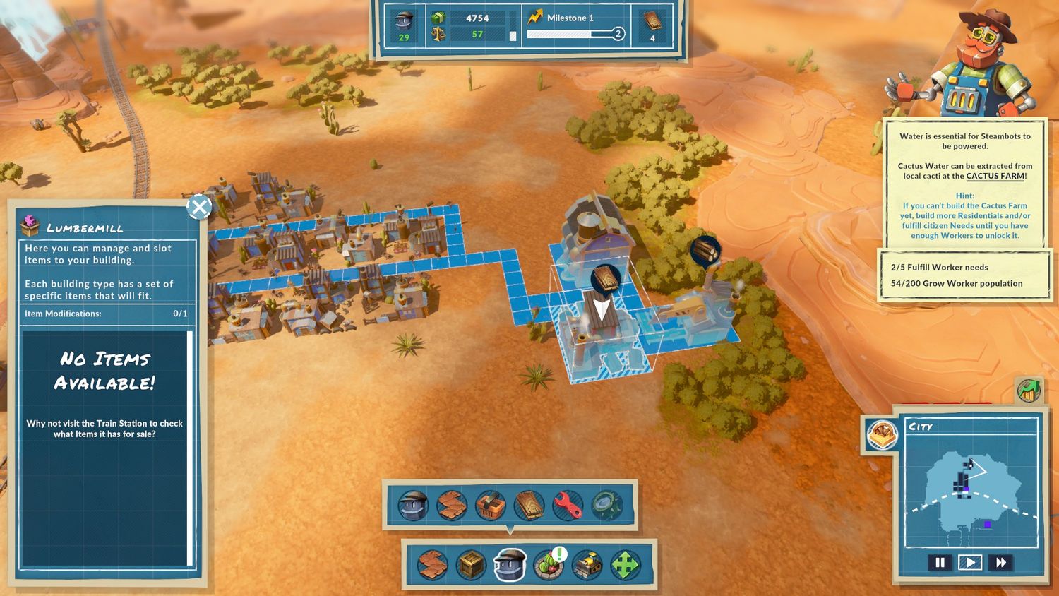 “/> Construcción de SteamWorld coloca a los jugadores en un planeta desértico en rápido deterioro inspirado en el Salvaje Oeste. A medida que se expandan, se descubrirán reliquias de tecnología antigua: piezas de un cohete que, una vez terminado, permitirá a la civilización escapar y construir una nueva vida en algún lugar más hospitalario. Para progresar, se deben alcanzar ciertos hitos basados en la población; Para atraer a nuevos ciudadanos a mudarse a la ciudad, será necesario construir ciertos alojamientos, como talleres de reparación y almacenes generales, todos los cuales se vinculan a un sistema global de cadena de suministro.