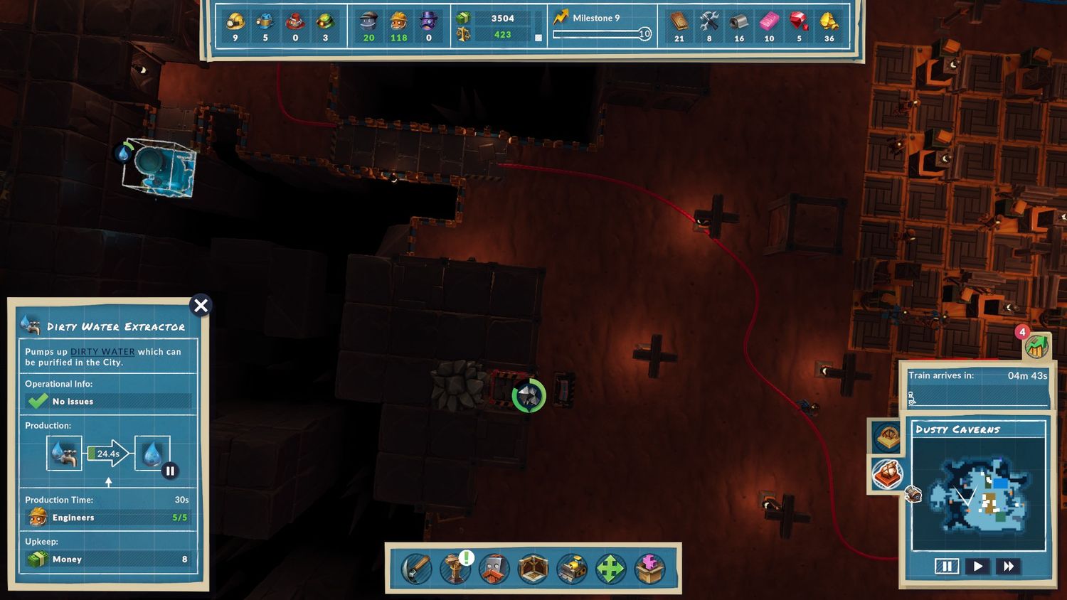 Los jugadores tendrán que lidiar con diferentes tipos de infraestructura en las minas, administrando cosas como sistemas de apoyo para evitar colapsos y puentes hacia nuevos espacios, así como sistemas de defensa como torretas. Se pueden seguir cables de diferentes colores repartidos por las minas para desbloquear nuevas áreas y descubrir nuevas piezas de cohetes, lo que crea una experiencia de expansión ligeramente predecible pero igualmente satisfactoria. Los jugadores deberán gestionar tanto las áreas en expansión de la mina como las cadenas de suministro constantes a la ciudad, ya que recursos como el petróleo y los minerales solo se pueden encontrar allí.