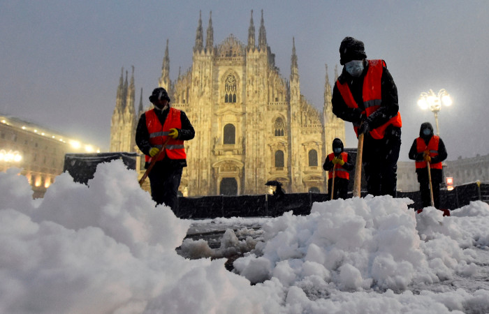 Trabajadores de la ciudad con mascarillas salieron al amanecer a las calles para quitar unos 15 centímetros de nieve frente a la céntrica Piazza Duomo, mientras el escaso tránsito matutino luchaba por avanzar por carreteras resbaladizas.