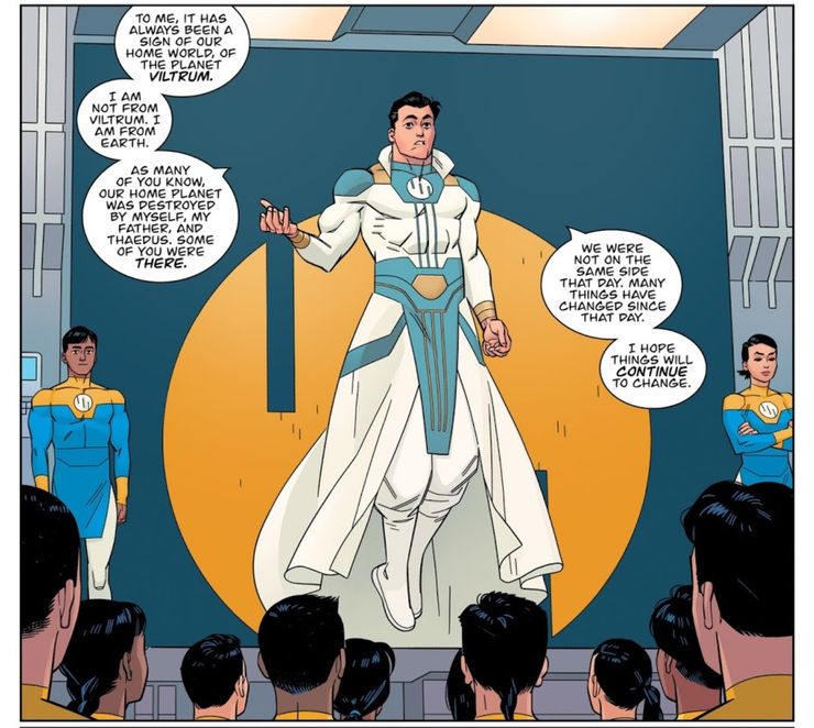 En el transcurso de la Invencible serie de Kirkman, Walker y Ryan Ottley, Mark Grayson lentamente acepta la historia violenta de la gente de Viltrumite. Junto con su padre, Omni-Man, ayuda a cambiarlos para mejor, incluso ocupando el lugar de su padre como líder tras su muerte. Bajo el liderazgo de Mark, los Viltrumites se convierten en una raza de pacificadores y héroes, cambiando el universo para mejor y creando un legado que dura siglos. Mientras tanto, Superman no tiene tanta suerte.