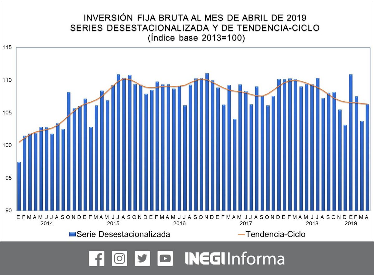 Durante abril de 2019, la Inversión Fija Bruta, que representa los gastos realizados en Maquinaria y equipo de origen nacional e importado, así como los de Construcción, registró una caída de 2.4 por ciento respecto al mismo mes del año pasado.