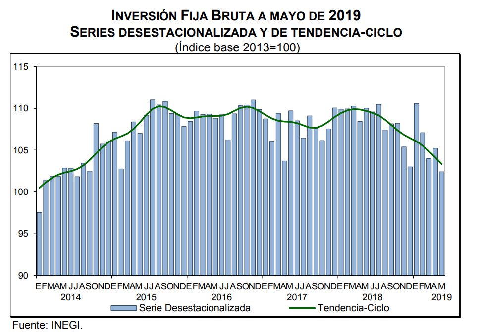 De enero a mayo de 2019, la Inversión Fija Bruta bajó 3.2 por ciento respecto al mismo periodo del año pasado, y a su interior, los gastos en construcción descendieron 2.4 por ciento, y los de maquinaria y equipo cayeron 4.2 por ciento a tasa anual.