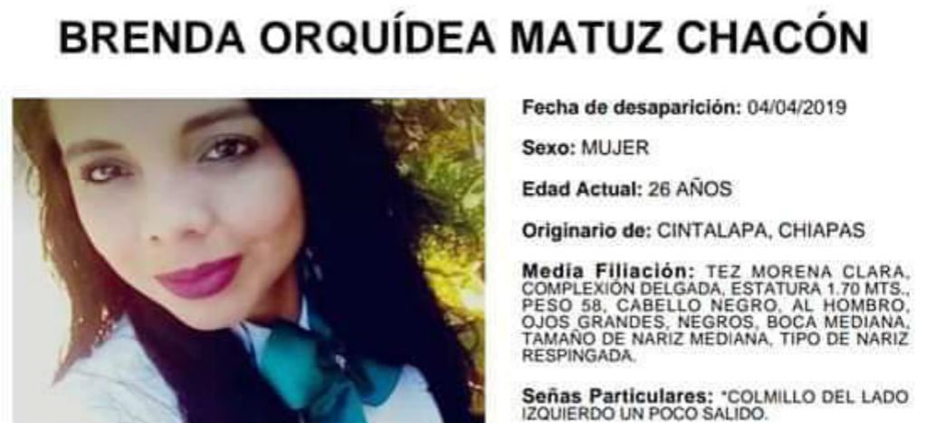 Brenda Orquídea Matuz Chacón fue reportada como desaparecida la noche del domingo 7, luego de que no llegara a su base militar el sábado. De acuerdo con la revista Proceso, Brenda Orquídea y otros cuatro militares salieron el viernes a Tuxtla Gutiérrez para pasar su día de descanso, pero ella fue la única que no volvió a su base.
