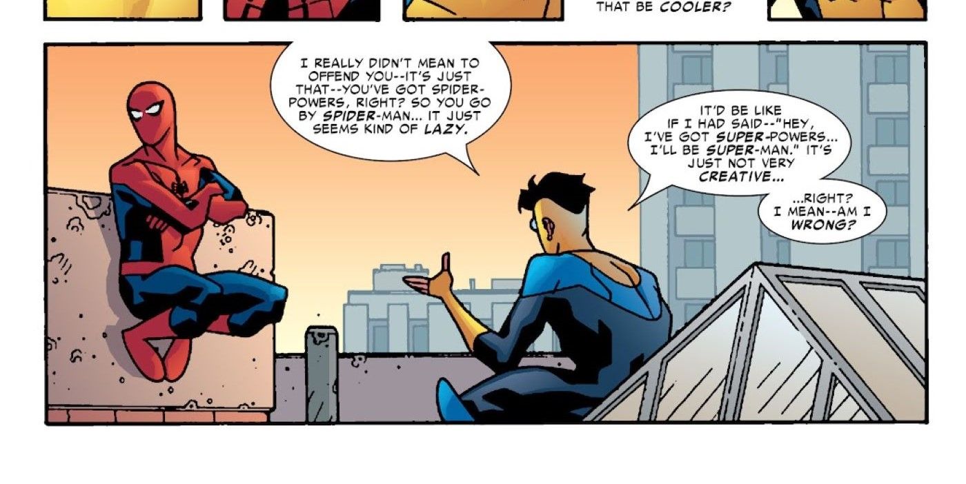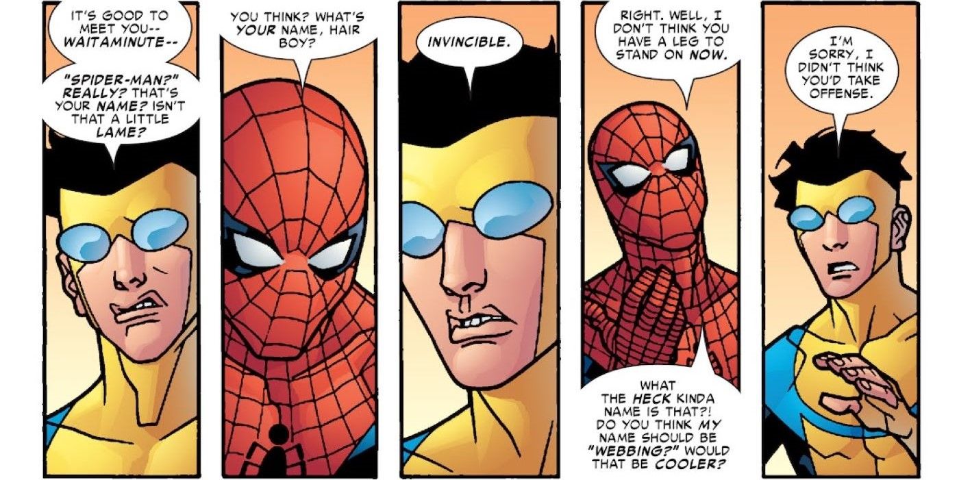 En Equipo Marvel Vol 3 #14, después de que Peter se presenta como Spider-Man, Invincible no puede evitar expresar su opinión sin filtrar de que ‘Spider-Man’ parece demasiado en la nariz para un tipo con ‘poderes de araña.’ Mark, reconociendo su ofensa involuntaria, se esfuerza por retroceder y aclarar su punto. Al intentar salir de su atolladero conversacional, Invincible comienza a racionalizar su punto de vista, enfatizando su creencia de que los nombres de superhéroes que son excesivamente literales parecen “vagos”. Procede a crear un ejemplo exagerado del nombre de superhéroe más ridículo que pueda imaginar y finalmente selecciona “Superhombre“, subrayando lo que él cree que es una absoluta falta de creatividad involucrada en un alias tan poco imaginativo.