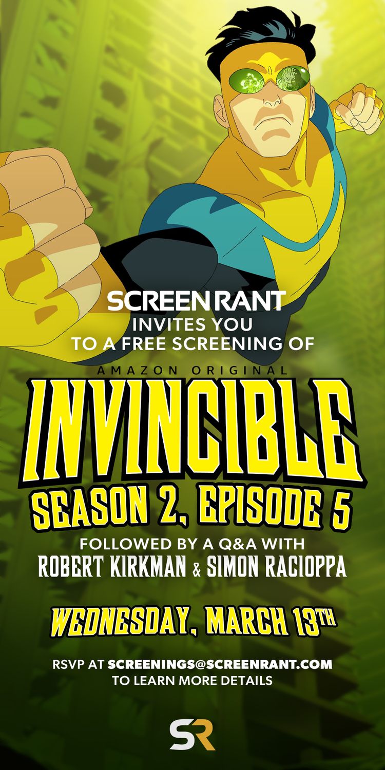 Faltando sólo unas pocas semanas para Invencible la temporada 2 regresa a Prime Video, Los lectores de Los Ángeles pueden participar en un sorteo para asistir a una proyección especial del episodio 5 de la temporada 2 el miércoles 13 de marzo, seguida de una sesión de preguntas y respuestas con los co-showrunners Robert Kirkman y Simon Racioppa. Los lectores pueden entrar. del sorteo enviando sus nombres completos por correo electrónico a proyecciones@.com! ¡Las confirmaciones de asistencia se realizarán por orden de llegada hasta que el teatro esté lleno!