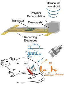 Es tan pequeño que se puede unir a un solo nervio o fibra muscular. Cuando el dispositivo se activa mediante un haz de ultrasonido, el voltaje corre entre los electrodos, y esta corriente diminuta se ve afectada por la actividad eléctrica del tejido. Estos ligeros cambios se reflejan literalmente en la forma en que los pulsos ultrasónicos se recuperan, y el lector puede derivar voltaje electrofisiológico de esos cambios.