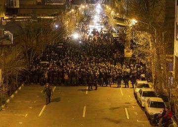 La policía antidisturbios iraní vigila a los manifestantes frente a la Universidad Amir Kabir de Teherán, este sábado. En vídeo, declaraciones del presidente iraní, Hasan Rohaní. AFP / VÍDEO: REUTERS-QUALITY