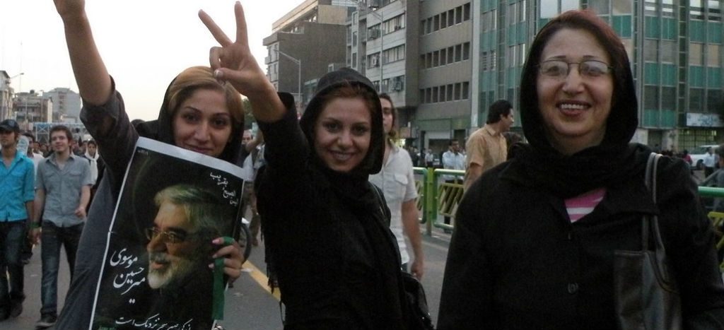 Un gran contingente que había avanzado por vías paralelas entraba a la avenida por una calle que yo no había visto. Eran cientos. Venían con las manos en alto y los dedos en V. Con telas verdes, carteles de Musaví, paños negros de luto. Dos muchachas estaban muertas de la risa por alguna razón. Todos sonreían. Por supuesto, había una madre con su par de hijas, no podían faltar. Cuando me di cuenta, mis ojos estaban llenos de lágrimas. Y mi alma, de admiración.