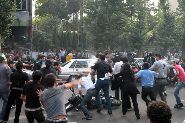 La multitud regresó así a la avenida, de donde había sido expulsada minutos antes por una carga de antidisturbios motorizados. Cuando los gobiernos están arrinconados por fuerzas populares, el ejército se atrinchera en las ciudades, pero el campo es de los guerrilleros. Algo parecido ocurría aquí. El objetivo de las autoridades era controlar la vialidad principal, como si fuera un gran río, para impedir que por él se desplazara la ola verde, y dispersarla por calles secundarias para que perdiera fuerza. A la policía y a las milicias les costaba un gran trabajo alcanzar una presencia dominante en la avenida, en tanto que las vías y callejones aledaños eran territorio rebelde.