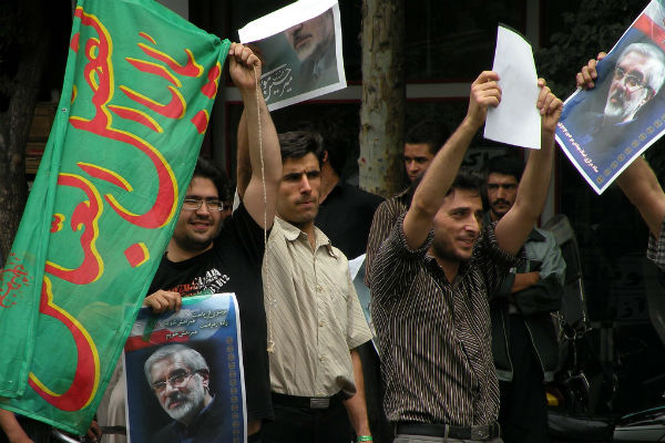 Un gran contingente que había avanzado por vías paralelas entraba a la avenida por una calle que yo no había visto. Eran cientos. Venían con las manos en alto y los dedos en V. Con telas verdes, carteles de Musaví, paños negros de luto. Dos muchachas estaban muertas de la risa por alguna razón. Todos sonreían. Por supuesto, había una madre con su par de hijas, no podían faltar. Cuando me di cuenta, mis ojos estaban llenos de lágrimas. Y mi alma, de admiración.