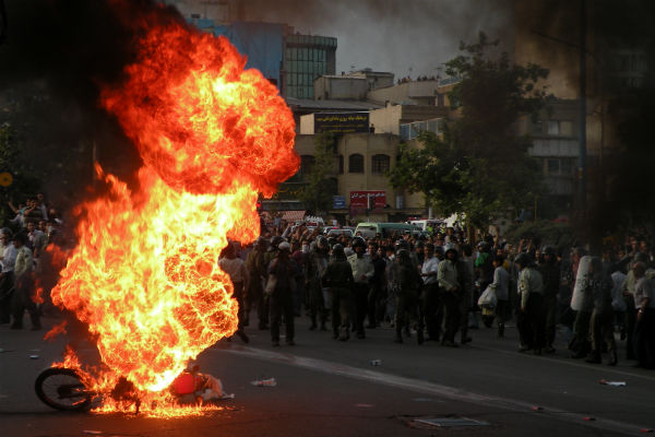 Las calles paralelas a Enguelab estaban llenas de manifestantes que arrastraban contenedores de basura para quemarlos. Ahí no entraba la policía. Los dueños de las tiendas regalaban botellas de agua. Damas en chador corrían de un lado para otro con cigarros encendidos, en busca de gaseados a los cuales echarles humo en los ojos. Grupos de jóvenes planeaban cómo retornar a la avenida. Hombres y mujeres de mayor edad, que tal vez participaron en la revolución de 1979, los proveían con el consejo de la experiencia. En la pared lateral de un edificio, un gran mosaico con los rostros de Jomeiní y Jameneí era el blanco de muchos paseantes airados que les arrojaban piedras. Unos niños las recogían y se las entregaban a un clérigo de turbante, quien a su vez las ofrecía a los que pasaban. Toda la comunidad estaba en resistencia.