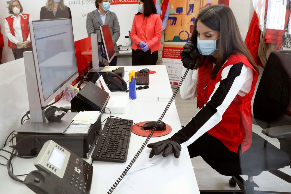La reina Letizia ha visitado este lunes una de las sedes de Cruz Roja en Madrid para conocer de primera mano la labor que desarrollan esta entidad y sus voluntarios durante la emergencia sanitaria, entre ellas, el apoyo a las personas mayores, con una de las cuales ha hablado para trasladarle su ánimo. Es la primera ocasión en la que doña Letizia sale en solitario del Palacio de la Zarzuela desde que se decretó el estado de alarma, después de que a finales de abril visitara con el rey Felipe las instalaciones del servicio de emergencia 112 y el pasado jueves la sede de la empresa Red Eléctrica Española.Vestida con un look informal en blanco y negro, zapatos planos y protegida en todo momento con mascarilla y guantes, la Reina ha estado durante dos horas en el local que la Cruz Roja tiene en la avenida Cardenal Herrera Oria de Madrid, una de las 1.400 sedes repartidas en todo el país. Después, con el chaleco de voluntaria y como presidenta de honor de dicha entidad, doña Letizia ha visto cómo se entregaban los productos básicos a las personas que lo necesitan. La Reina ha estado acompañada por la ministra de Política Territorial y Función Pública, Carolina Darias; el alcalde de Madrid, José Luis Martínez Almeida; y el presidente de Cruz Roja Española, Javier Senent, entre otras personalidades.La visita ha comenzado con una reunión en la que le han explicado las principales medidas del programa Cruz Roja Responde, puesto en marcha desde hace casi dos meses ante la emergencia de la covid-19, que ha movilizado a más de 40.000 voluntarios y que ha llegado a 1,5 millones de personas. El plan incluye varias áreas de actuación, como salud, educación,empleo y asistencia a mayores.La voluntaria Raquel Aparicio ha cedido el teléfono a la reina para que conversara con una de las mujeres que reciben este servicio de apoyo. “Me alegro, Ángeles. No te molesto más. Quería saludarte porque estoy haciendo una visita a esta sede local de la Cruz Roja. Muchísimas gracias por atenderme”, se ha despedido la Reina. A continuación, doña Letizia ha participado en una videollamada con uno de los 8.748 niños que participan en un programa de apoyo escolara familias con pocos recursos. “Te voy a dejar estudiar, Antonio. Sigue esforzándote, que lo estás haciendo muy bien”, le ha animado para que pueda pasar al siguiente curso en septiembre. En su recorrido, la reina ha charlado con varios empleados y voluntarios de distintos departamentos, como los que asesoran a personas que han perdido su trabajo y los que regulan el acceso al local. Desde el inicio de la pandemia, la reina Letizia ha seguido muy de cerca la actividad realizada por Cruz Roja Española a través de distintas videoconferencias desde su despacho.Como una más, doña Letizia ha estado también en el almacén para conocer cómo se preparan los botes de comida y productos de higienes y cómo los voluntarios cargan en los coches para repartirlos a los hogares más necesitados. Desde el inicio de la crisis, la entidad benéfica ha entregado más de 450.000 kit de productos básicos. Los responsables de Cruz Roja han contado a la Reina que la intención es que el programa de ayuda ante la pandemia se prolongue durante nueve meses, debido al impacto económico que va a tener la crisis, con la idea de atender a más de 2,4 millones de personas.