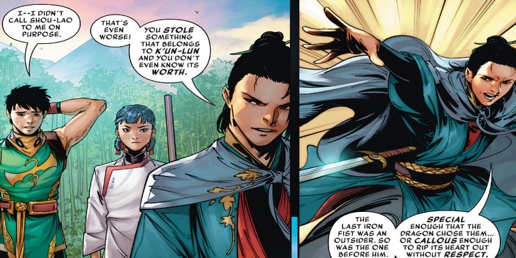 Yang-Yi tiene razón en su evaluación: ha habido Iron Fists que no nacieron en K’un-Lun, y esta es una llamada astuta a algunos de los problemas más problemáticos del personaje. Danny Rand es un estadounidense blanco, pero Shou-Lao aún lo eligió para ser Iron Fist; este tropo, de una persona blanca europea que llega a una cultura diferente y lo demuestra, es demasiado común en la ficción, y Iron Fist no es una excepción. El personaje fue creado para sacar provecho de la locura de las películas de artes marciales de principios de la década de 1970, pero en lugar de tener una persona china en el papel, era alguien de ascendencia europea. Si bien Danny demostró ser digno del título una y otra vez, sigue siendo problemático. El nuevo Iron Fist, aunque chino, todavía no es de K’un-Lun, lo que hace que los lectores se pregunten si alguna vez habrá un Iron Fist de la antigua ciudad.