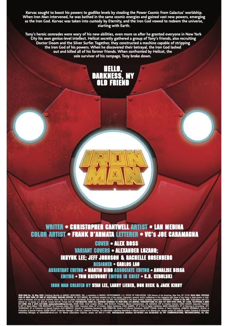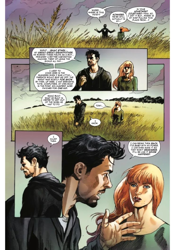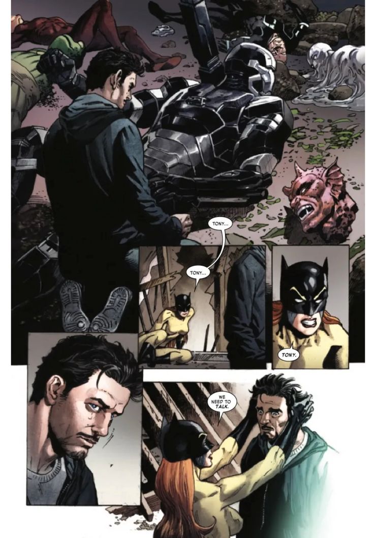 En una nueva vista previa de Hombre de Acero # 18 de Marvel Comics, Tony Stark se sienta en la sangre y los pedazos rotos de sus amigos. Silver Surfer se derrite en el suelo, el cuello de War Machine se rompe cuando su cabeza mira hacia el lado equivocado, y Gargoyle está en pedazos después de convertirse en piedra y romperse. A diferencia de la MCU, los nuevos poderes de dios de Iron Man le hicieron perder el control total y absoluto mientras mataba a todos los que intentaban ayudarlo y detenerlo.