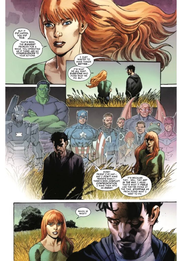 Patsy Walker confronta a Iron Man sobre lo que sucedió, y Tony le dice que puede solucionar el problema y traerlos de regreso con su poder, incluso haciéndolos recordar como si nunca hubiera sucedido. Sin embargo, Walker saca a relucir un buen punto, diciéndole que no puede operar como si sus acciones no tuvieran consecuencias. Iron Man hace una rara admisión de que a menudo crea conflictos con sus amigos y los convierte en su enemigo porque a menudo ve que se interponen en su camino.