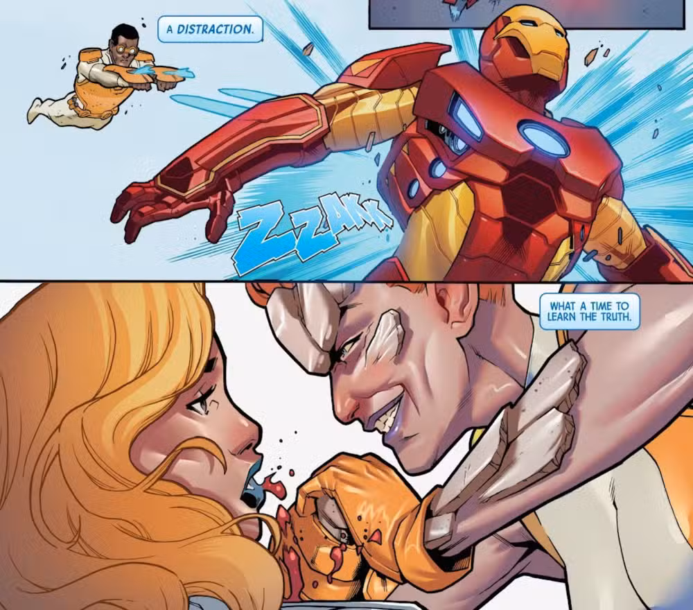 En Hierro y escarcha #1la tradición de Marvel avanza unos años hasta los albores de la Era del Apocalipsis. Mientras las fuerzas del villano Revelación intentan reclamar Nueva York, Iron Man y Emma Frost se encuentran luchando contra un grupo de malvados mutantes afuera de la Mansión de los Vengadores. Y cuando Emma es apuñalada fatalmente, la respuesta de Tony le hace darse cuenta de que él realmente está enamorado de ella. La emisión viene de Cavan Scott, Ruairí Coleman, Roberto Poggi, Yen Nitro y Joe Sabino.
