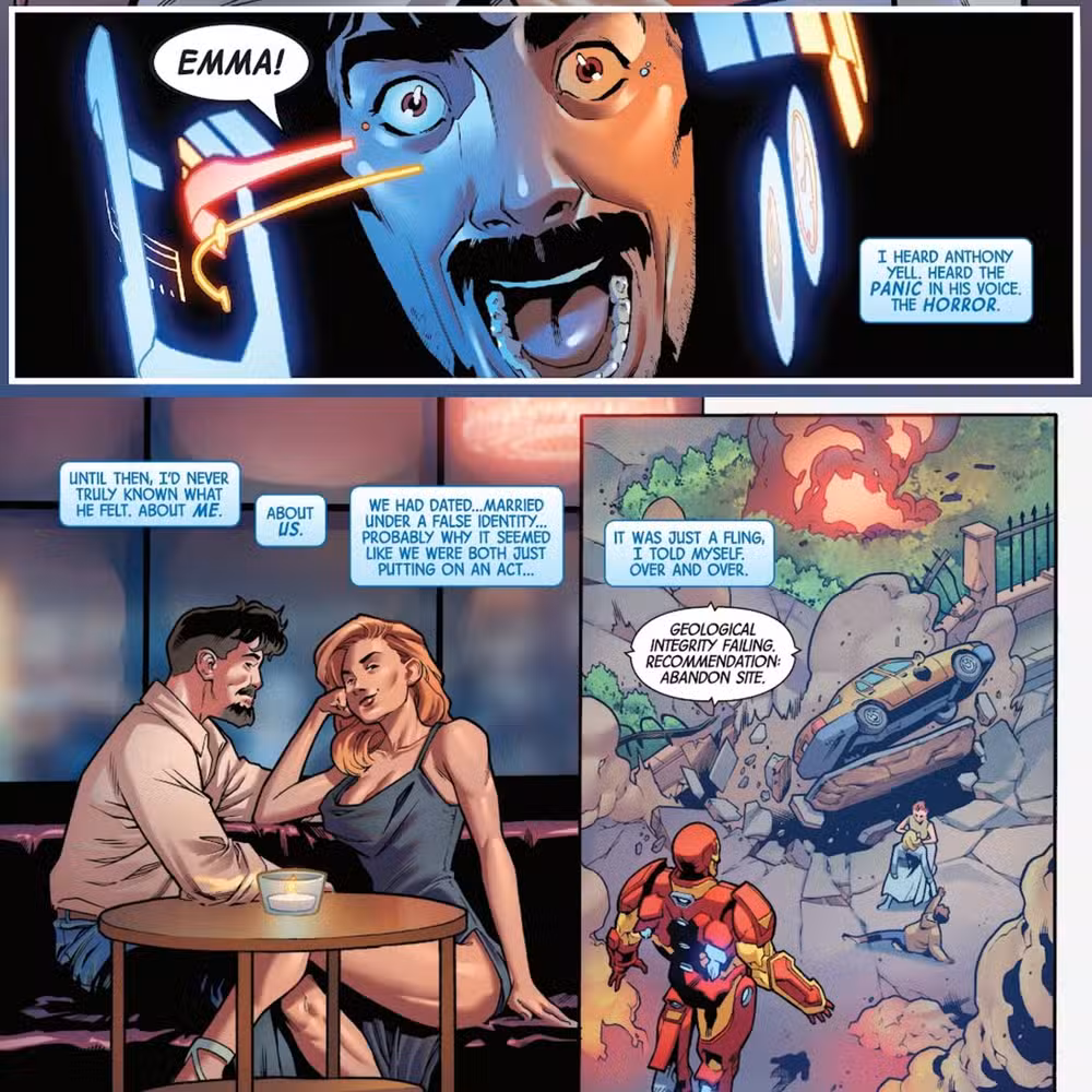 En cómics recientes, Iron Man y Emma Frost se casaron por razones tácticas, durante una época en la que los X-Men eran perseguidos en todo el mundo. Si bien los dos comenzaron a sentir una conexión romántica real, rápidamente se separaron una vez que pasó el peligro y Emma descartó su coqueteo como una distracción durante un momento imposible. Sin embargo, cuando Marrow la apuñala en el corazón, la reacción de dolor de Iron Man le hace darse cuenta de que él realmente la ama.