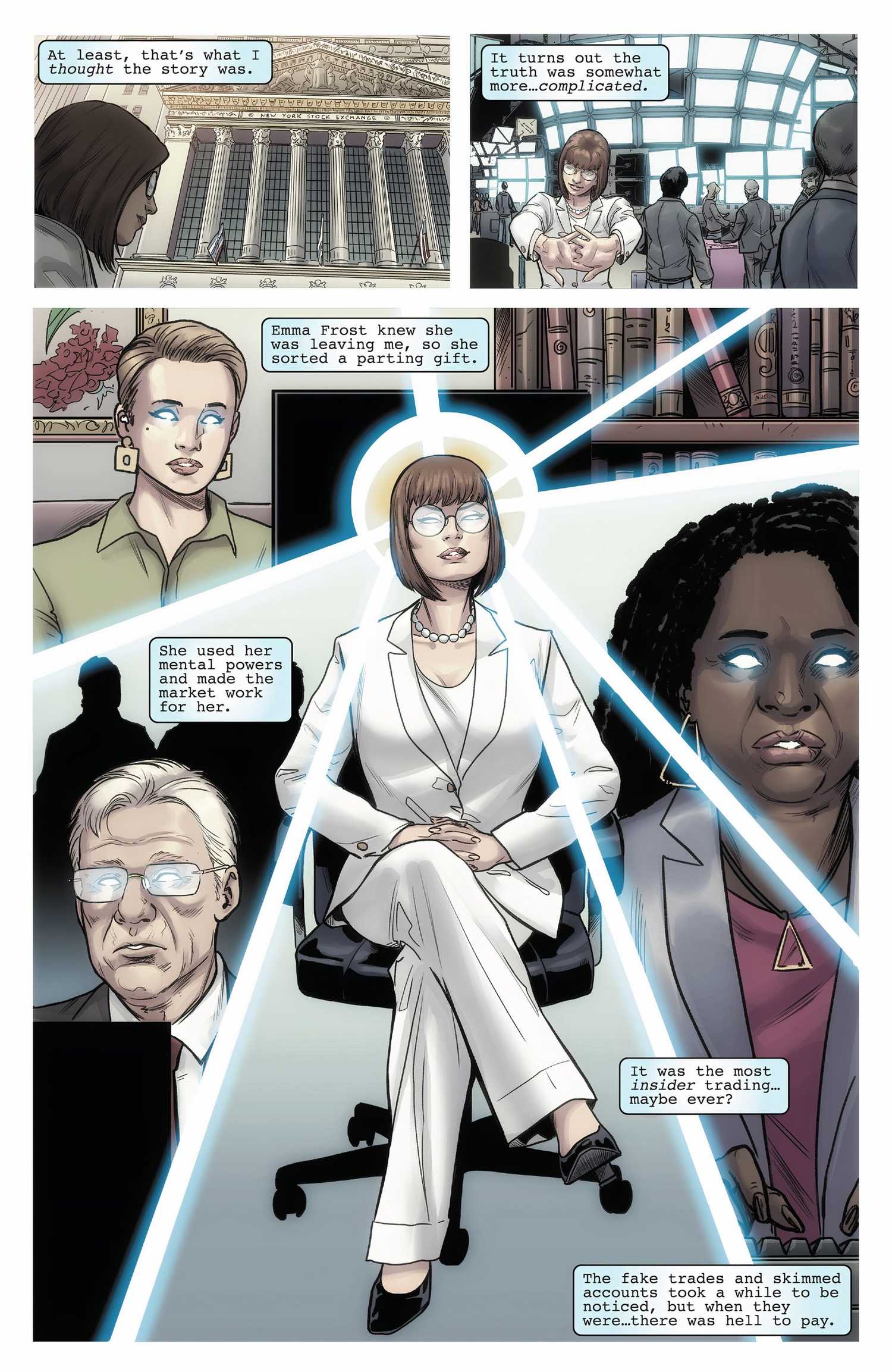 En un momento en el que Tony intenta convencer a Emma de por qué deberían seguir siendo una pareja poderosa (a pesar de que todo es falso por razones de superhéroes), se revela que Emma no está presente actualmente con Tony, sino que se está proyectando telepáticamente en la habitación. Al decirle a Tony que no puede estar con él de ninguna manera significativa, Emma le deja un sobre con un cheque a su nombre y le dice que Emma cree que Tony “le dará un buen uso a esos unos y ceros”, y agrega descaradamente que no puede esperar a ver todas las formas brillantes en que Tony “lo desperdiciará todo”.