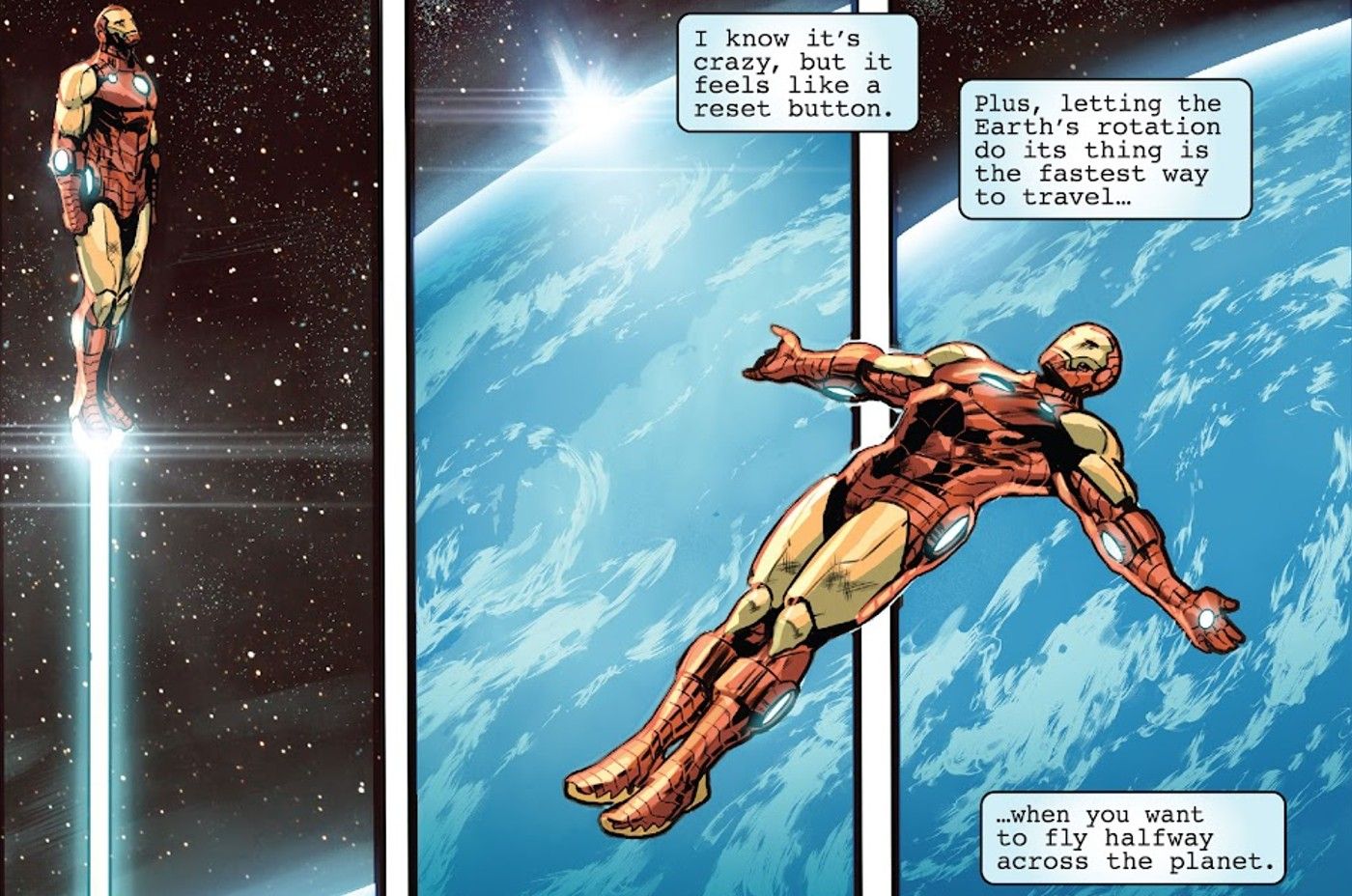 Gracias a su armadura de alta tecnología, Tony Stark no está limitado a los modos normales de viaje. Los propulsores a reacción en sus botas le permiten alcanzar velocidades supersónicas, y la armadura de Stark lo protege de los elementos, lo que le permite sobrevivir en las frías profundidades de la atmósfera superior y actúa como un escudo contra el viento y cualquier otro desecho que pueda encontrar. Sin embargo, cuando Tony necesita atravesar el mundo lo más rápido posible, usa un truco simple pero inteligente que demuestra que su cerebro es el arma más poderosa de Tony.