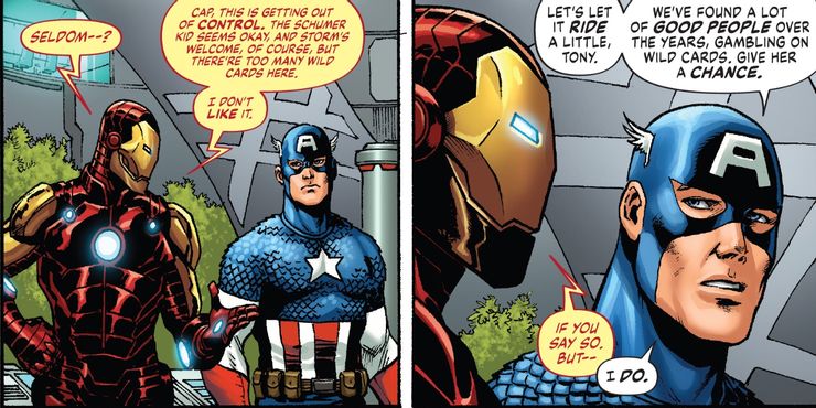 Iron Man no se lleva bien con el nuevo Warbird, a pesar de los intentos del Capitán América por mantener la paz; Iron Man tampoco se siente cómodo con la presencia de Aarkus. Le expresa estas preocupaciones al Capitán América, temiendo que la situación sea “salirse de control.” Iron Man no tiene problemas con algunos miembros, pero otros, como Warbird y Aarkus, son “comodines,algo con lo que Iron Man no se siente cómodo. Tony tiene un intercambio muy tenso con Aarkus y nuevamente expresa su descontento, afirmando que el grupo no está acostumbrado a luchar en equipo y que el error más pequeño puede destruir incluso el mejor plan. Los temores de Iron Man se hacen realidad cuando el equipo se enfrenta a Lady Lotus, y Warbird se desvía del plan, dejando que su ira e ira se hagan cargo.
