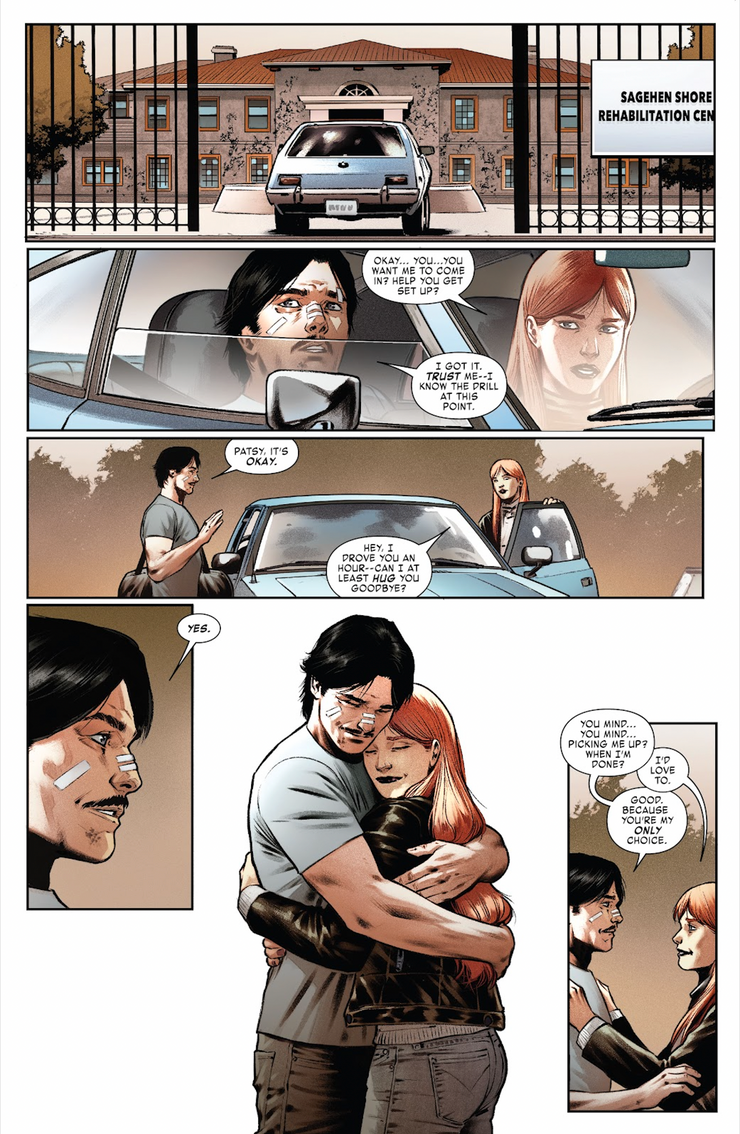 En hombre de hierro #19, escrito por Christopher Cantwell con arte de Cafu, Stark lucha contra el malvado Korvac una vez más, pero esta vez, Stark ha renunciado voluntariamente al Poder Cósmico y ya está cerca de la muerte incluso antes de que llegue Korvac. Quizás porque Tony se ha reducido a sí mismo a una figura patética, Korvac no mata a Stark y lo lleva a un hospital. Algún tiempo después, Patsy Walker lleva a Tony a un centro de rehabilitación para ayudarlo a dejar su adicción a los opiáceos. Hellcat agradece a Tony por pedirle que lo lleve al lugar, a lo que Tony responde. “Tú eras mi única opción”. Él lleva el punto a casa al decir la misma línea nuevamente después de que Hellcat se ofrece como voluntario para recoger a Tony cuando haya terminado en el centro.