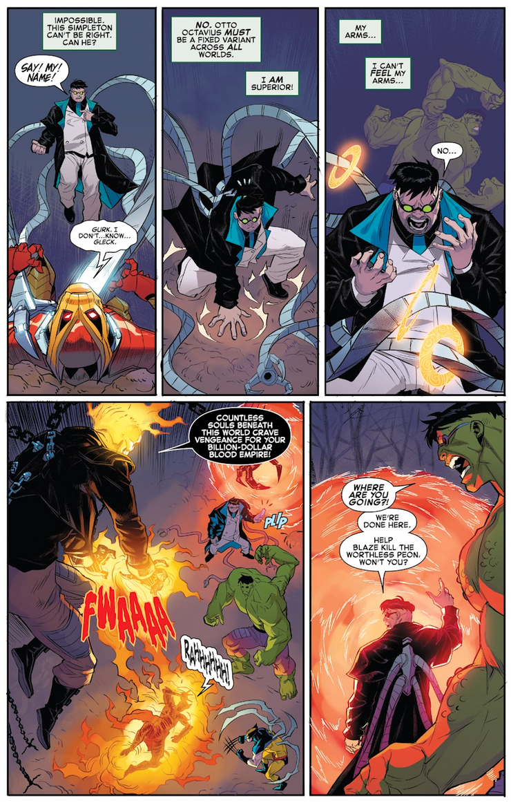 Los cuatro deciden usar el Puente para viajar a través del multiverso para descubrir si realmente son superiores, y forzar el problema si ese no es el caso. Otto Blaze advierte a los otros tres pulpos que “… un alma inmoral” ha notado su presencia, e inmediatamente después, el grupo es atacado por una variante de Iron Man que se hace llamar Iron Scab. El grupo acaba con el vengador blindado alternativo, pero Otto Blaze detecta los asesinatos de Iron Scab. Él quema su armadura a un crujiente, gritando “¡Innumerables almas debajo de este mundo anhelan venganza por tu imperio de sangre de mil millones de dólares!” La llama de otro mundo cocina vivo a Scab, y Otto Banner presumiblemente terminó el trabajo.