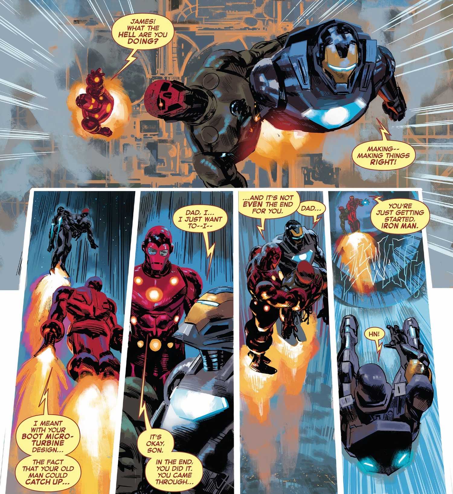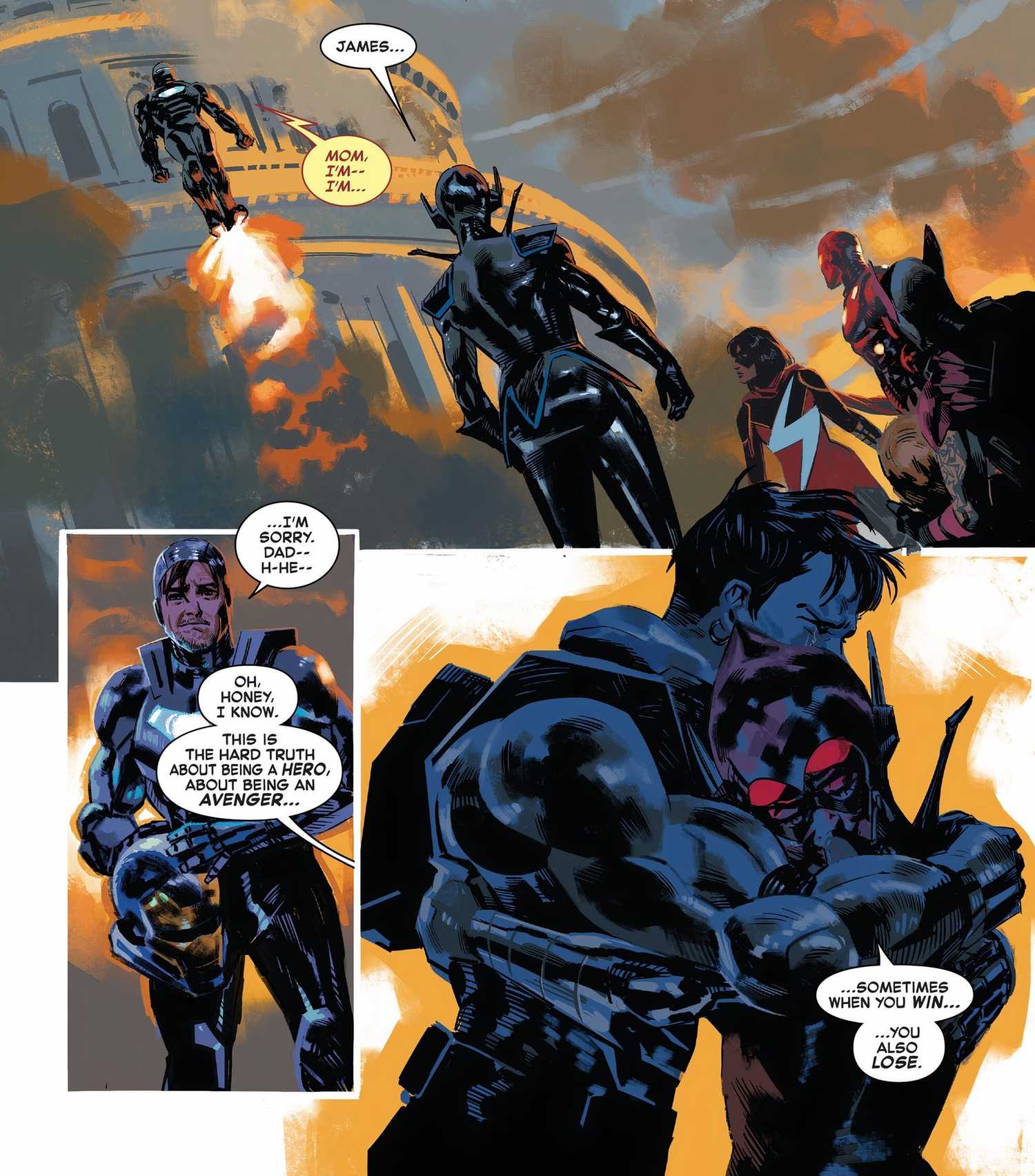 - Iron Man hace el máximo sacrificio para salvar a su hijo, James Stark, en Vengadores: Crepúsculo #6.
