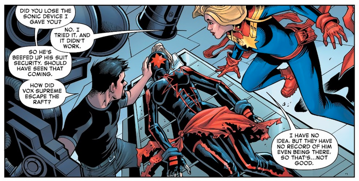 Después de concluir su largo arco luchando contra el villano Ove (y enfureciendo al Doctor Strange y a todos los usuarios de magia en la Tierra en el proceso), Carol comienza un nuevo capítulo en su vida al ser atacada mientras volaba por el aire. El asaltante lleva un traje oscuro familiar que Carol usó mientras hacía las órdenes de Vox Supreme (aunque de mala gana). Carol cree que su atacante está sufriendo la misma suerte y usa un dispositivo sónico que le dio Tony; la máquina liberó a Carol una vez, pero no tiene ningún efecto sobre el usuario del traje. Desafortunadamente, Carol pronto se da cuenta de que ha golpeado a su atacante con demasiada fuerza: no tiene pulso.
