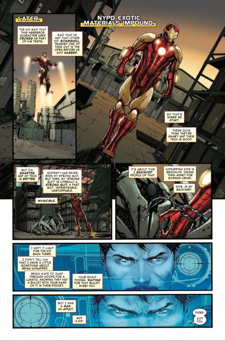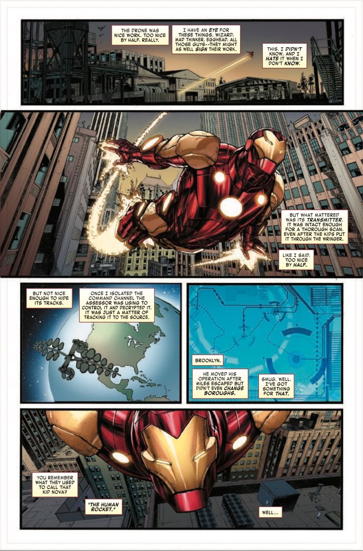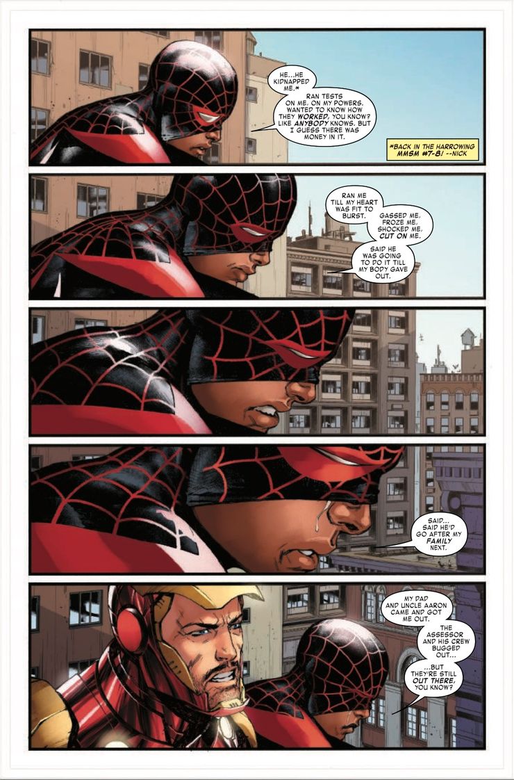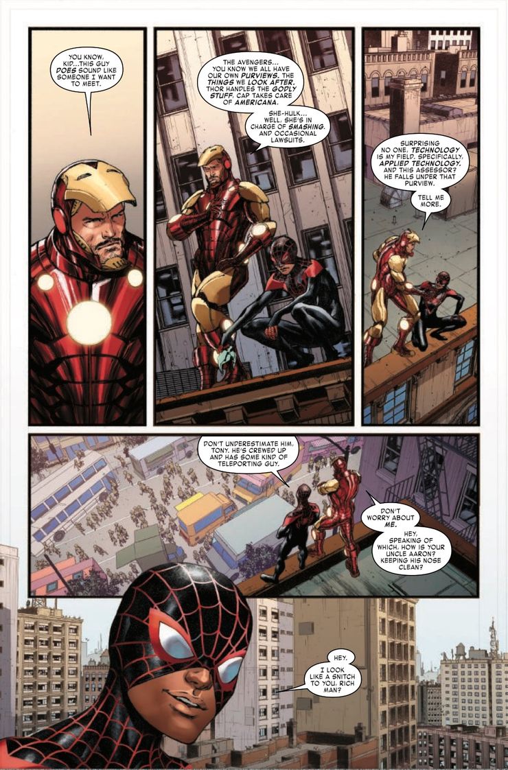 Ahora, la vista previa de Iron Man Anual # 1 ve a Tony Stark persiguiendo a los villanos que capturaron y torturaron al Spider-Man de Miles Morales conocido como el Asesor y su ejecutor Quantum. Iron Man también le revela a Miles que los Vengadores suelen enfrentarse a nuevos villanos si entran en su ámbito y área de especialización particulares. Por ejemplo, Thor se ocupa de lo piadoso y lo sobrenatural, el Capitán América se ocupa de los problemas que amenazan al país y el propio Iron Man asume los peligros relacionados con las tecnologías aplicadas. Como resultado, está más que dispuesto a rastrear al Asesor y al Quantum (cuyas capacidades de teletransportación parecen indicar la presencia de la Piedra Espacial). Aquí están las páginas de vista previa de Marvel Comics: