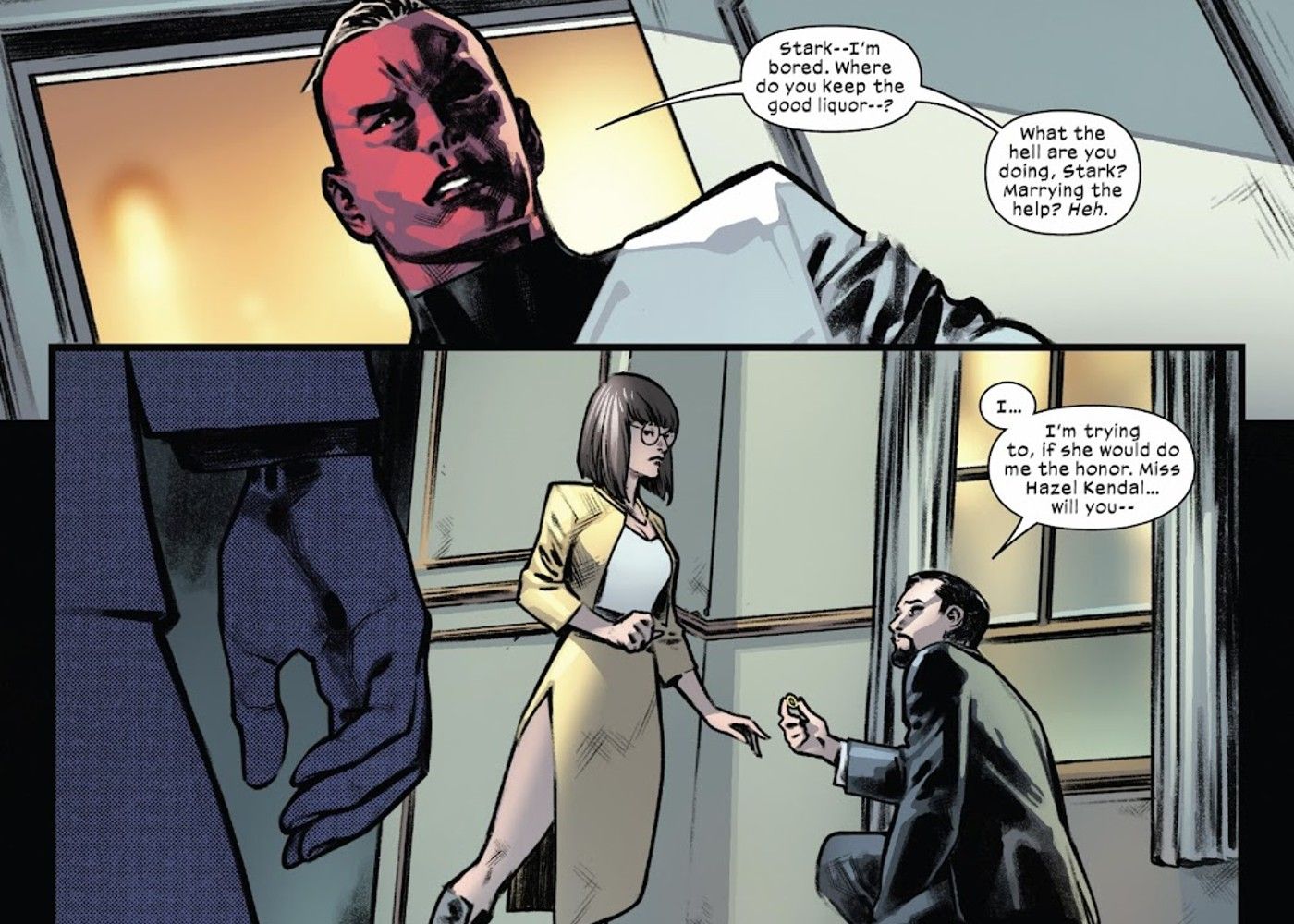 Desde el momento en que cruza las puertas de la capilla alquilada de Las Vegas, los ojos de Tony Starks se fijan en Emma Frost. O, más bien, mira a Hazel Kendal, a quien anteriormente Iron Man se refiere como “la hija de Emma”.armadura,” cual ella puede tirarlo tan pronto como termine su misión. Lleva un vestido de novia rojo y Tony queda absolutamente asombrado al ver su belleza. Inmediatamente sabe que esto va en contra del acuerdo que habían acordado, lo que le permite darse cuenta de que estaban absolutamente condenados desde el comienzo de su tiempo juntos.