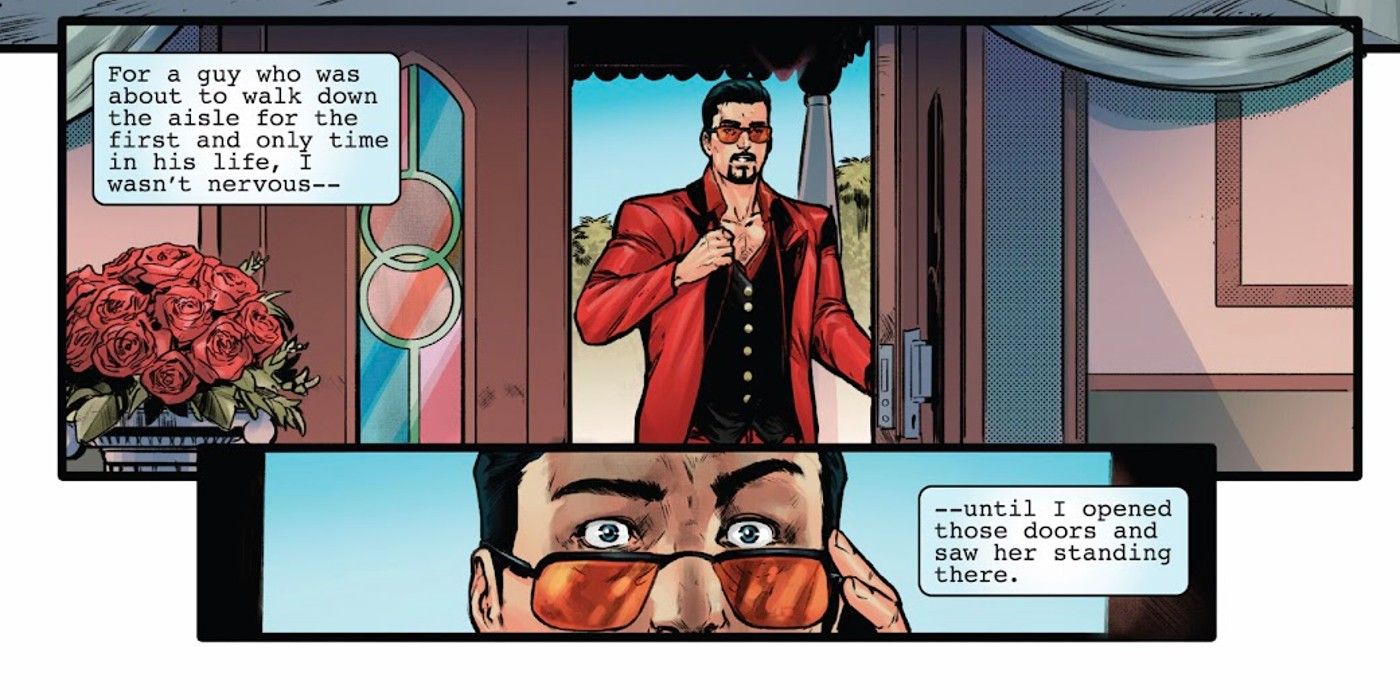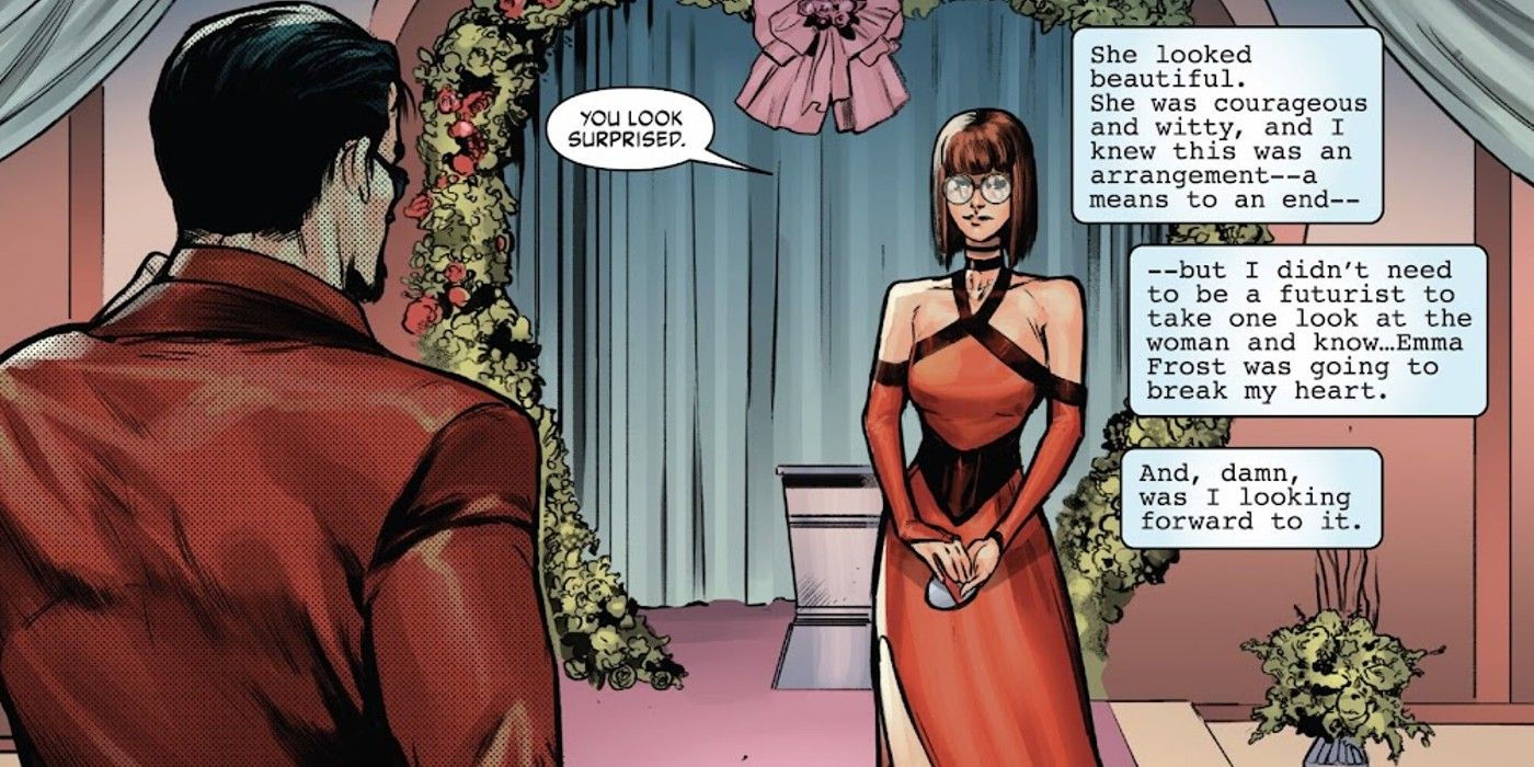 Al acercarse al altar, Tony sabe exactamente en lo que se está metiendo y piensa: “Emma Frost iba a romperme el corazón. Y, maldita sea, lo estaba deseando”.