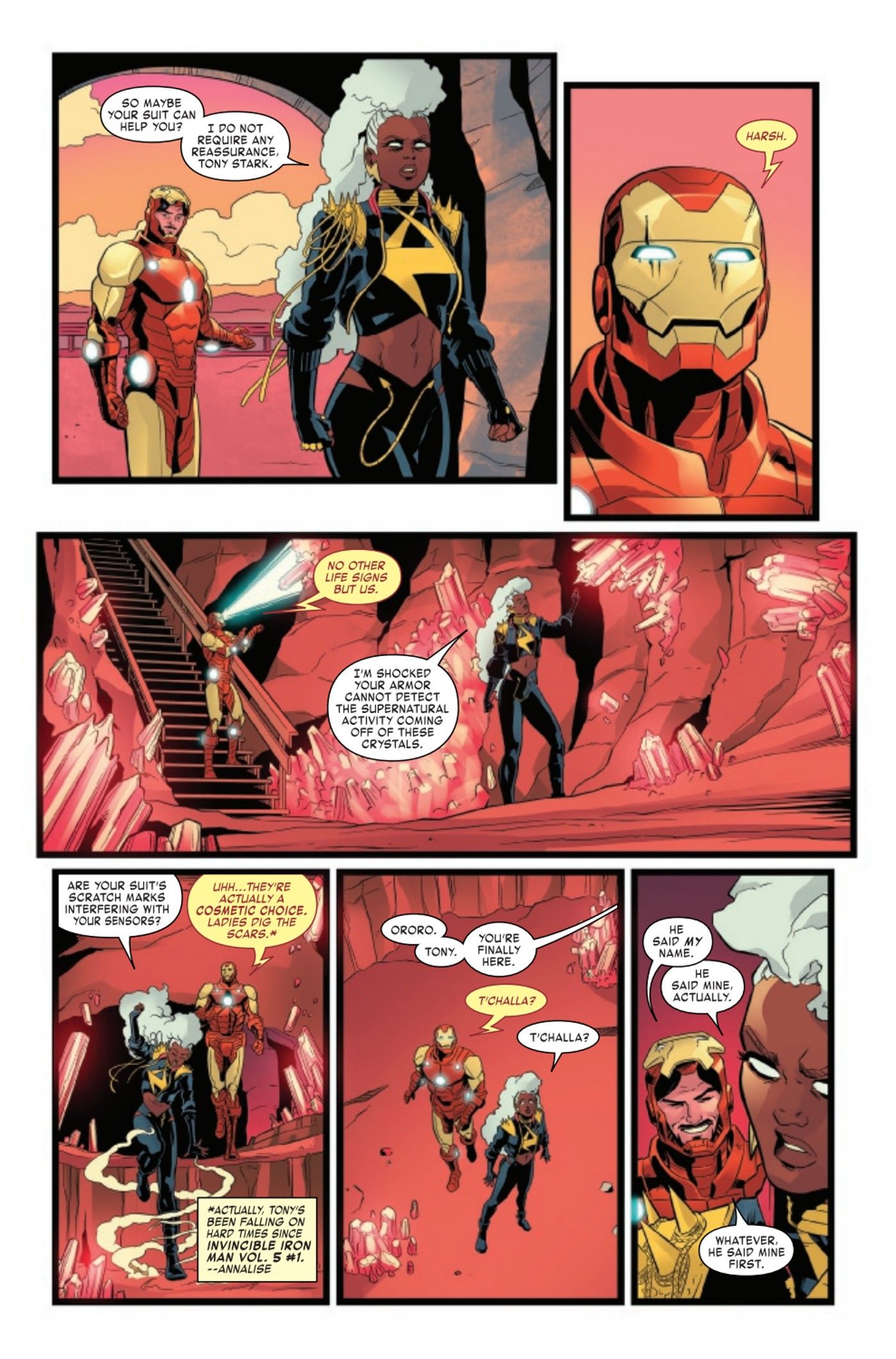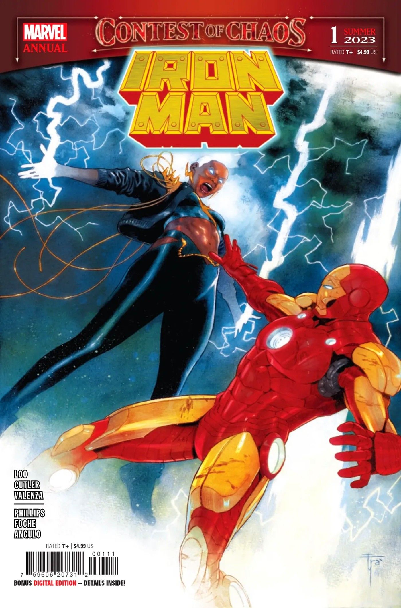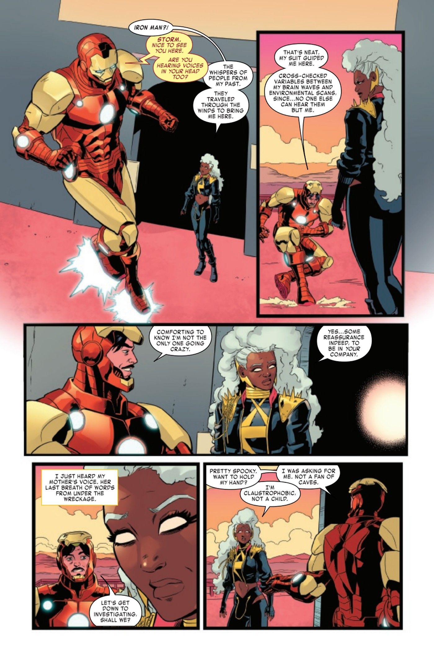 En una vista previa del problema compartido por Marvel, Iron Man y la Tormenta de X-Men investigan una cueva misteriosa, a la que han sido llamados por susurros sospechosos (probablemente los de Agatha Harkness, quien está orquestando el Concurso del Caos por su cuenta). significa.) A medida que los dos buscan más profundamente, se hace evidente que la cueva puede aprovechar sus inseguridades y arrepentimientos más profundos, convenciéndolos de que el otro héroe los está incitando a pelear. Cuando concluye la vista previa, Iron Man le dispara a Storm, comenzando una pelea para la que quizás no esté preparado para ganar. Invencible Iron Man Anual # 1 proviene de Jason Loo, David Cutler, Bryan Valenza y Joe Caramagna.