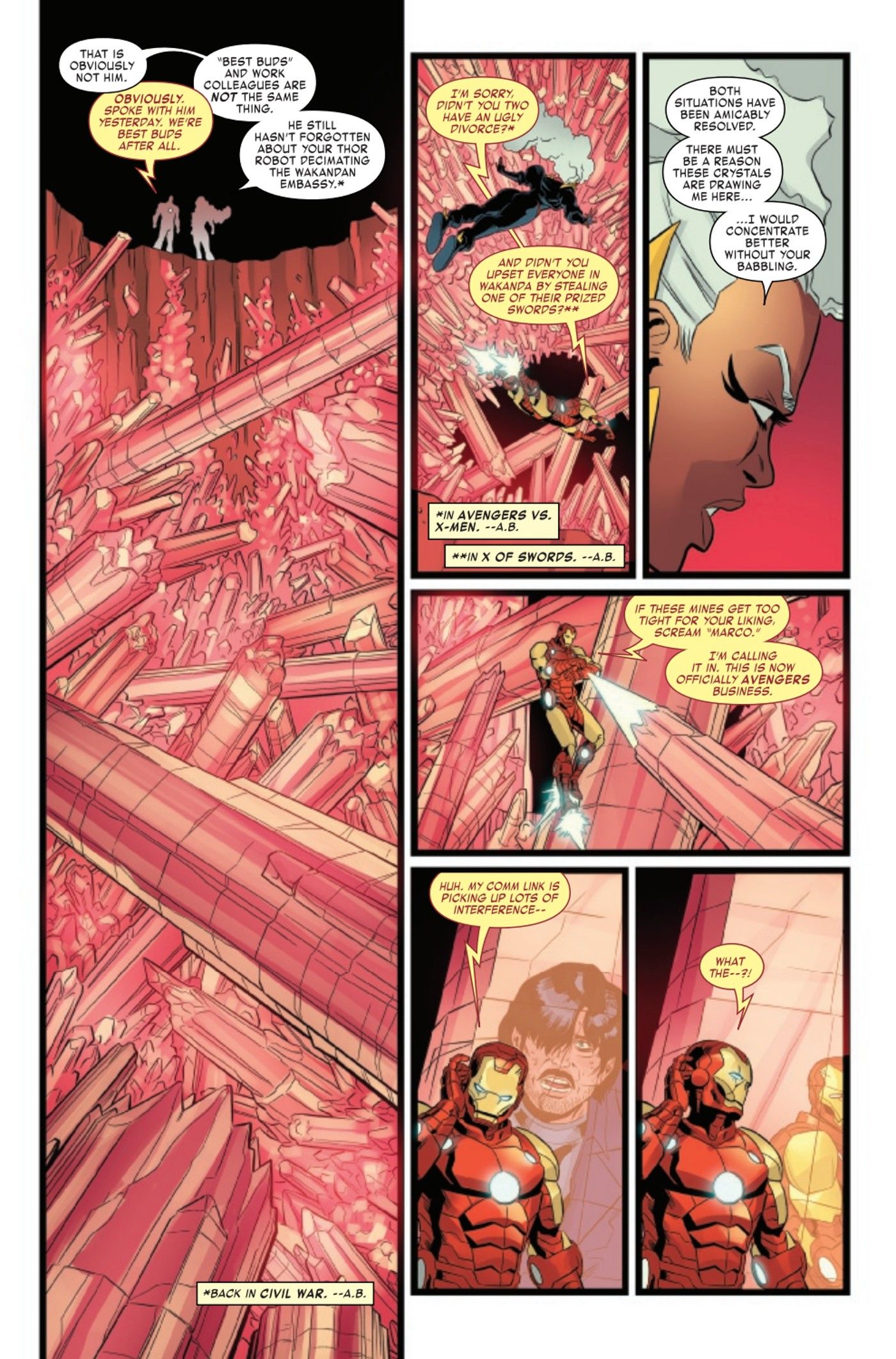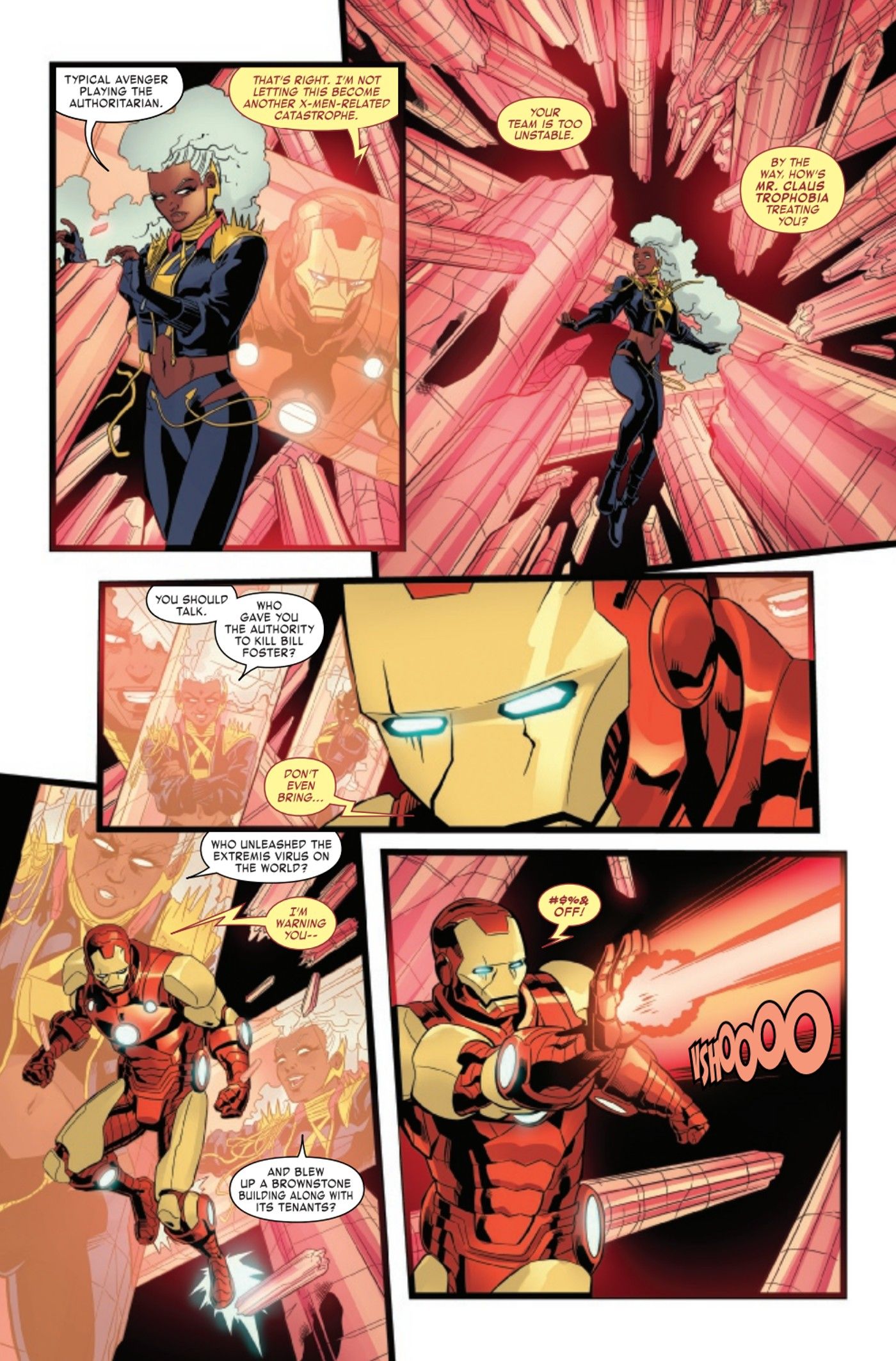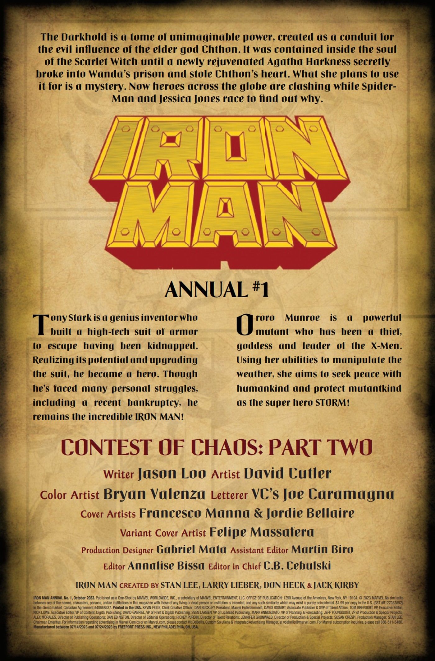 En una vista previa del problema compartido por Marvel, Iron Man y la Tormenta de X-Men investigan una cueva misteriosa, a la que han sido llamados por susurros sospechosos (probablemente los de Agatha Harkness, quien está orquestando el Concurso del Caos por su cuenta). significa.) A medida que los dos buscan más profundamente, se hace evidente que la cueva puede aprovechar sus inseguridades y arrepentimientos más profundos, convenciéndolos de que el otro héroe los está incitando a pelear. Cuando concluye la vista previa, Iron Man le dispara a Storm, comenzando una pelea para la que quizás no esté preparado para ganar. Invencible Iron Man Anual # 1 proviene de Jason Loo, David Cutler, Bryan Valenza y Joe Caramagna.
