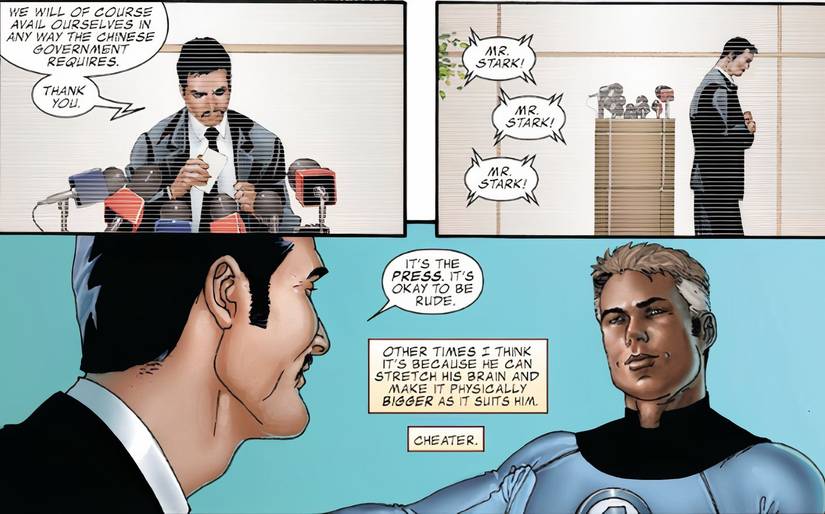 El hombre de hierro invencible (2008) El número 4, escrito por Matt Fraction, con arte de Salvador Larroca, presenta un intercambio entre los dos heroicos colegas, en el que Tony sugiere que El poder cerebral de Reed proviene de sus superpoderes, lo que sugiere que Mister Fantastic puede estirar su cerebro para aumentar su capacidad intelectual.