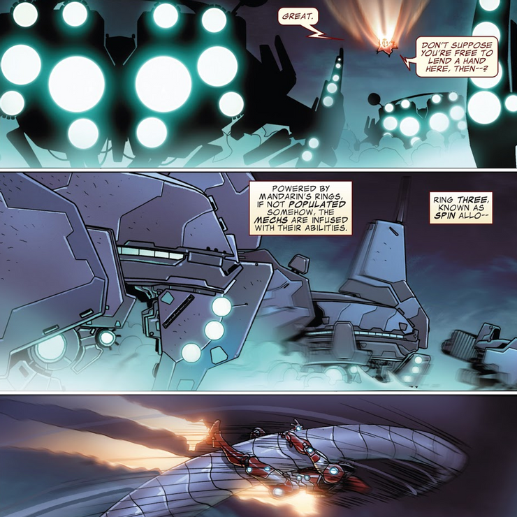 Después de verse obligado a trabajar para el Mandarín, Iron Man construyó la devastadora armadura Titanomech, que aprovechó el poder de los Diez Anillos de Shang-Chi.
