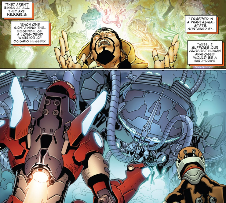 Recientemente, Marvel Comics presentó un nuevo conjunto de Diez Anillos manejados por Shang-Chi que se asemejan más a cómo las películas los reinventaron. Sin embargo, los Diez Anillos originales han pertenecido durante mucho tiempo al Mandarín, quien los rescató de una nave espacial Makluan en su juventud. El mandarín luego afirmó que no eran anillos en absoluto, sino dispositivos de almacenamiento futuristas, cada uno de los cuales se usaba para guardar los recuerdos y las habilidades de un antiguo guerrero alienígena. Estos guerreros querían nuevos cuerpos capaces de abandonar la Tierra, y no había nadie mejor para crearlos que el Vengador acorazado.