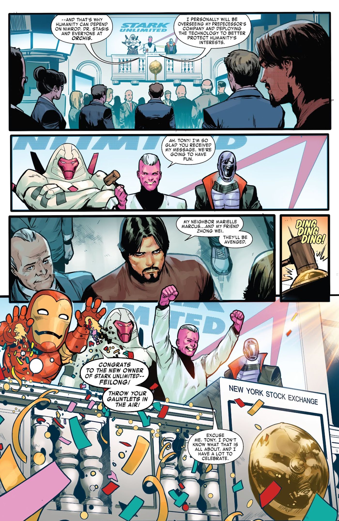 En El invencible hombre de hierro #4, de Gerry Duggan, Juan Frigeri y Bryan Valenza, Tony finalmente se enfrenta al misterioso villano que está detrás de los recientes ataques en su contra. Feilong es un villano relativamente reciente de X-Men, un multimillonario tecnológico que se alió con Orchis después de que los mutantes reclamaran Marte, aplastando su sueño de colonizar el planeta. Después de comprar la mayoría de las acciones de Stark Unlimited en la Bolsa de Nueva York, Feilong es el nuevo propietario de la empresa, pero no está solo. Nimrod y Doctor Stasis, dos de los escalones superiores de Orchis, van a celebrar con él, y Feilong incluso anuncia al público que se desplegará la tecnología Stark.para proteger mejor los intereses de la humanidad“.